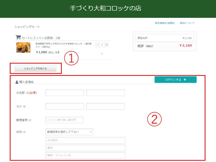 ①ホームぺージに戻る、他商品を追加する場合、「お買い物を続ける」をクリックします。